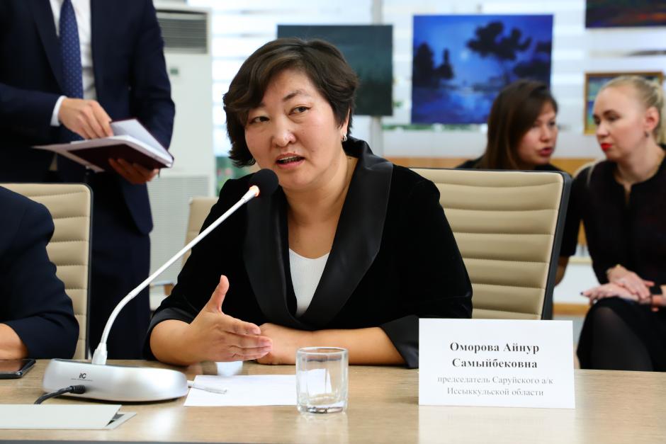 Айнура Оморова, председатель Сарууского сельского совета, обсуждает 30-процентную квоту в пресс-кафе, организованном Программным офисом в Бишкеке, ноябрь 2019 г.