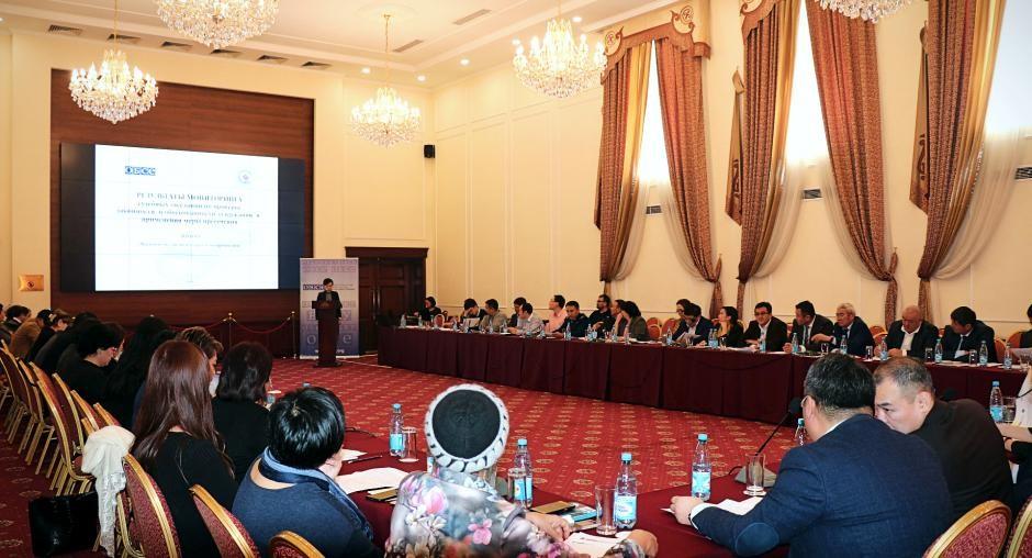 Следственные судьи, прокуроры, адвокаты и представители гражданского общества обсуждают результаты мониторинга судебных процессов на круглом столе по совершенствованию ориентированного на права человека подхода, используемого следственными судьями в уголовном судопроизводстве. Бишкек, 29 ноября 2019 года. (ОБСЕ/Ранат Рысбек кызы)