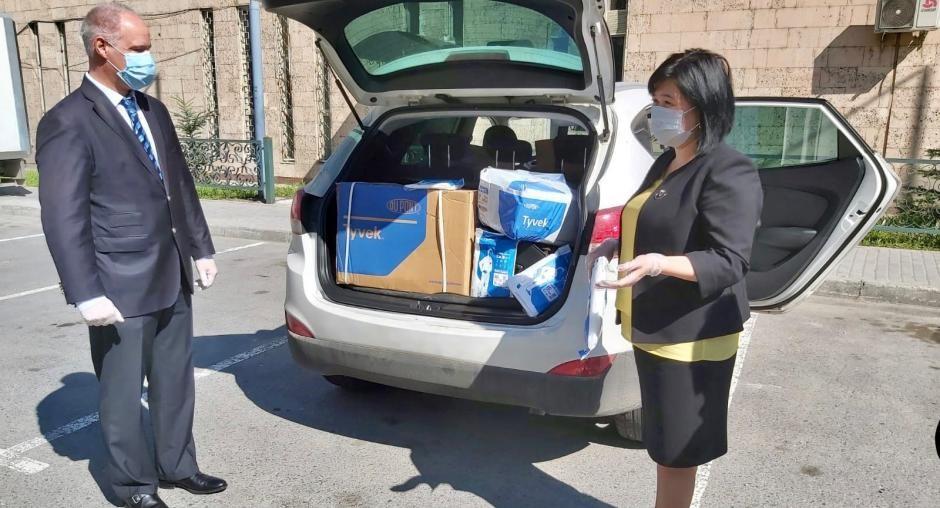Пьер фон Аркс, глава Программного офиса ОБСЕ в Бишкеке, и Азиза Солтонбекова, заместитель Министра труда и социального развития, осуществляют передачу средств индивидуальной защиты в рамках помощи Офиса Правительству во время пандемии COVID-19. (ОБСЕ/Стейн Сваанен)