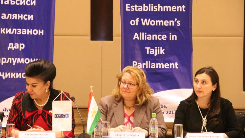 Хайринисо Юсуфи, Вице-спикер нижней палаты Парламента Республики Таджикистан, Туула Юрьёля, Глава Офиса программ ОБСЕ в Душанбе и Весна Иванович-Кастаред, сотрудник по гендерным вопросам и вопросам борьбы с торговлей людьми Офиса программ ОБСЕ в Душанбе (слева-направо), 30 ноября 2017 г.