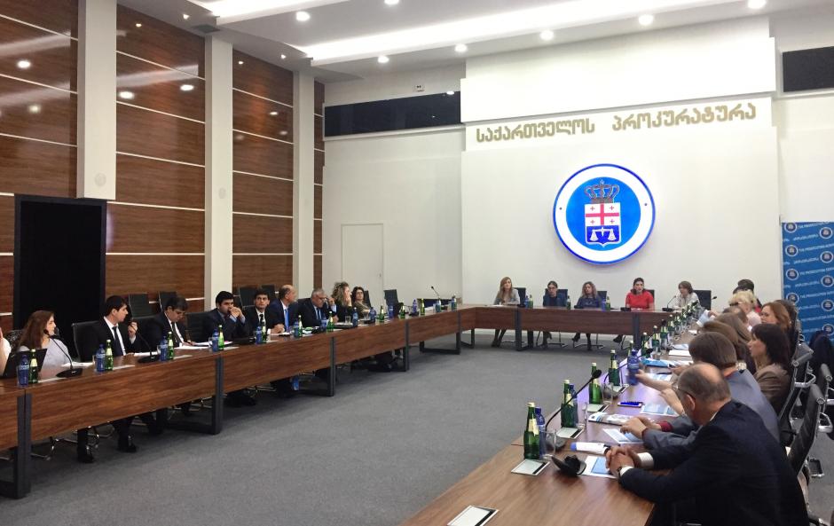 Официальные делегации правительств Таджикистана и Республики Беларусь во время визита в Генеральную прокуратуру Грузии в целях изучения реформы грузинской судебной системы, в частности дел, связанных с подозреваемыми детьми, свидетелями и жертвами, Тбилиси, 9 октября 2018 года.