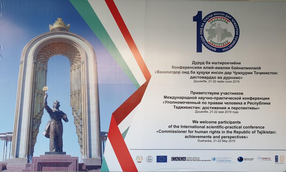 Баннер конференции, посвященной десятилетию института Уполномоченного по правам человека в Таджикистане, Душанбе, 22 мая 2019 года.