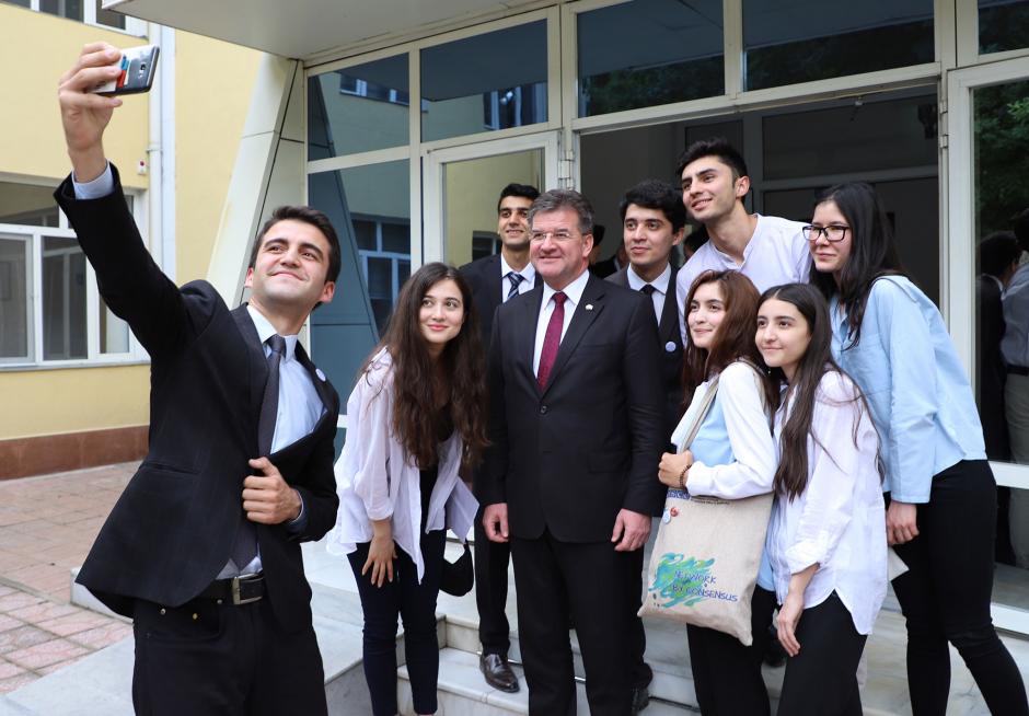 Представители молодежи снимают селфи с действующим председателем ОБСЕ Лайчаком, Душанбе, 22 мая 2019 года.
