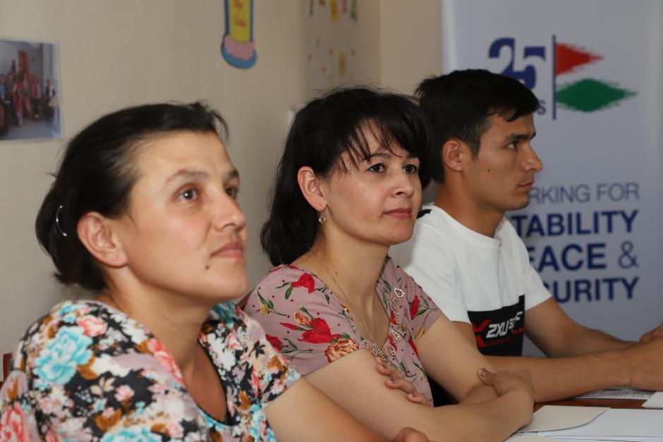 Гулрухсор Мелибоева (в центре), как и другие участники, не знала о правах, которыми могут пользоваться лица с ограниченными возможностями, и в ее случае - о том, на что она имеет право, как мать-одиночка, Худжанд, 4 июля 2019 года.