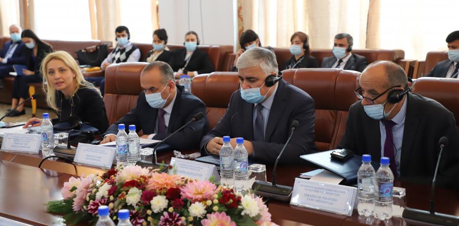 Теа Джалиашвили (слева), заместитель Главы программного офиса ОБСЕ в Душанбе, во время выступления на конференции, посвященной новой Национальной антикоррупционной стратегии Таджикистана, Душанбе, 27 октября 2021 года.