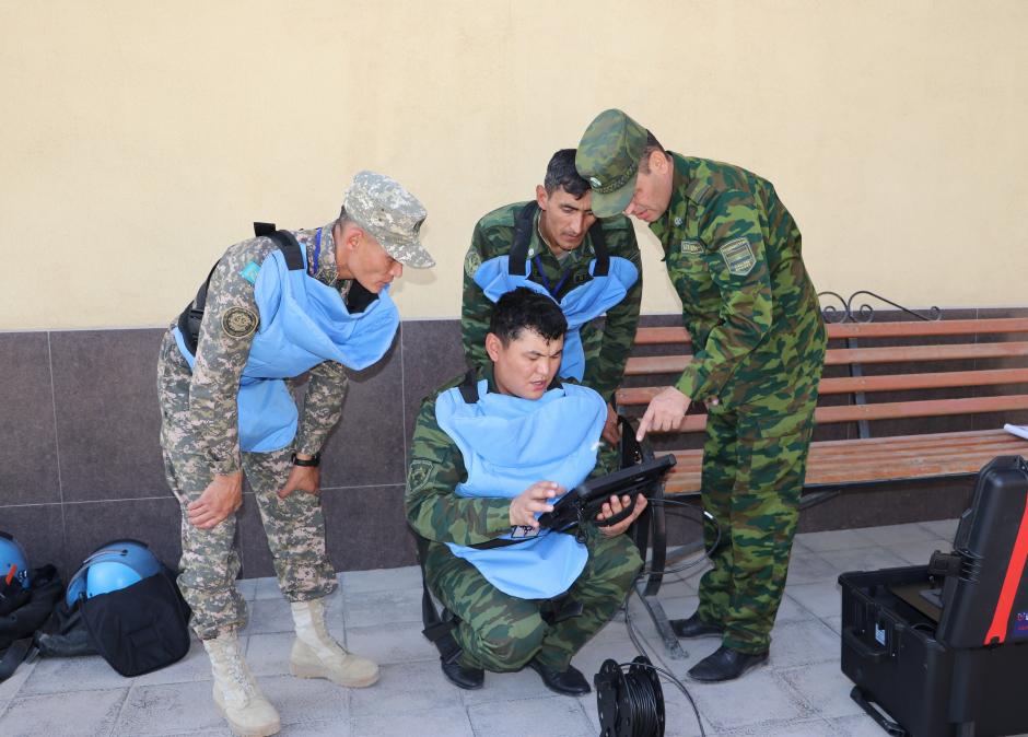 Участники регионального курса по обезвреживанию взрывоопасных предметов (уровень 2) во время практических занятий, Чимтеппа, Таджикистан, 14 октября 2021 года.