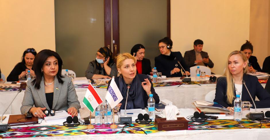 (слева направо) Дилрабо Мансури, заместитель председателя Маджлиси намояндагон Маджлиси Оли Республики Таджикистан, Теа Джалиашвили, Исполняющая обязанности Главы Программного офиса ОБСЕ в Душанбе и Юлия Нетесова, руководитель Отдела БДИПЧ по демократическому управлению и гендерным вопросам на открытии семинара по реализации гендерного равенства в парламенте Таджикистана, Душанбе, 15 февраля 2022 года.