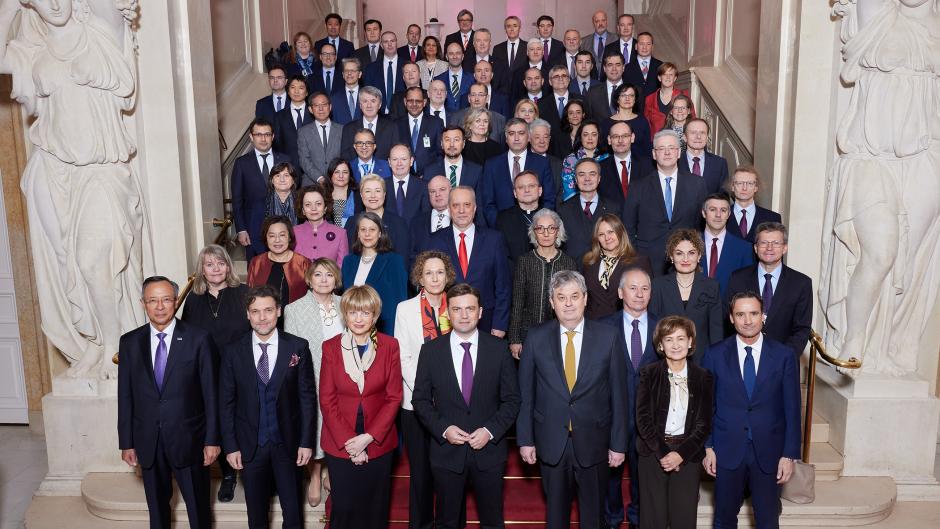 Главы полевых офисов и институтов ОБСЕ позируют для группового фото с Генеральным секретарем ОБСЕ Хельгой Марией Шмид и Действующим председателем ОБСЕ, Министром иностранных дел Северной Македонии Буяром Османи во время Ежегодного совещания Председателя и Секретариата с главами полевых офисов и институтов, Вена, 13 января 2023 года.