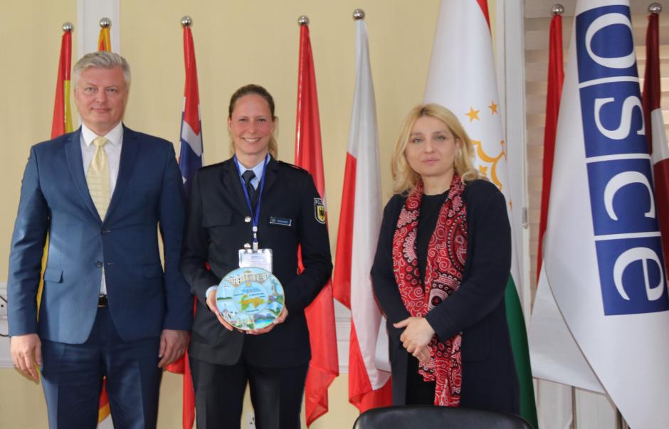 (слева направо) Ихар Кузьминич, Начальник Отдела подготовки и обучения Колледжа ОБСЕ для руководящего пограничного состава; Беате Шмидт, Заместитель Менеджера среднего звена из Германии и Тея Джалиашвили, Исполняющая обязанности Главы Программного офиса ОБСЕ в Душанбе на церемонии окончания 34-го курса для пограничного персонала, Душанбе, 24 марта 2023 года.