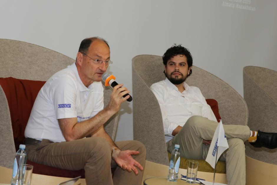 Посол Дьердь Сабо, Глава Офиса программ ОБСЕ в Нур-Султане (слева), Самуэль Года, Специальный представитель действующего председателя ОБСЕ по делам молодежи и безопасности (справа) на открытии 13-го семинара Центрально-азиатской молодежной сети (CAYN), Алматы, 25 июня 2019 года.