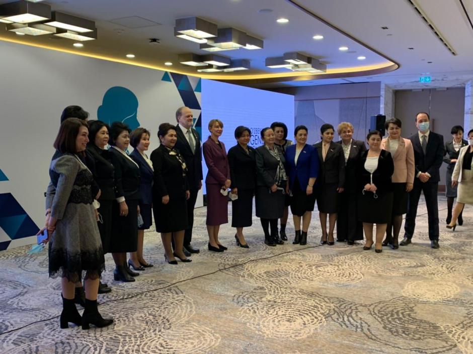Посол Джон МакГрегор, Председатель Сената Танзила Нарбаева, постоянный представитель ПРООН в Узбекистане Матильда Димовска, и женщины-парламентарии во время первого Форума женщин-парламентариев Узбекистана,Ташкент, 14 декабря 2020 года, г.