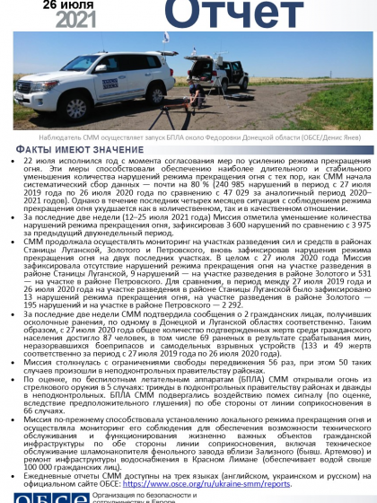 В отчете представлен обзор работы Специальной мониторинговой миссии ОБСЕ (СММ), последние события и новости по состоянию на 26 июля 2021 года.