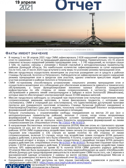 В отчете представлен обзор работы Специальной мониторинговой миссии ОБСЕ (СММ), последние события и новости по состоянию на 19 апреля 2021 года.