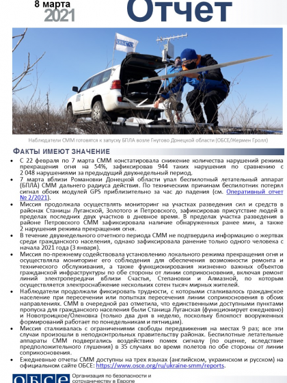 В отчете представлен обзор работы Специальной мониторинговой миссии ОБСЕ (СММ), последние события и новости по состоянию на 8 марта 2021 года.