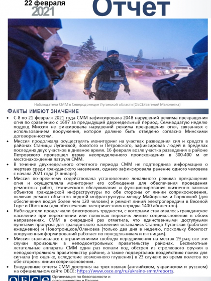 В отчете представлен обзор работы Специальной мониторинговой миссии ОБСЕ (СММ), последние события и новости по состоянию на 22 февраля 2021 года.