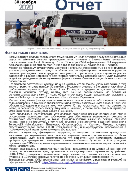 В отчете представлен обзор работы Специальной мониторинговой миссии ОБСЕ (СММ), последние события и новости по состоянию на 30 ноября 2020 года.