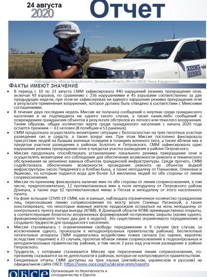 В отчете представлен обзор работы Специальной мониторинговой миссии ОБСЕ (СММ), последние события и новости по состоянию на 24 августа 2020 года.