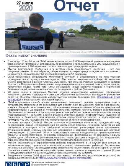 В отчете представлен обзор работы Специальной мониторинговой миссии ОБСЕ (СММ), последние события и новости по состоянию на 27 июля 2020 года.