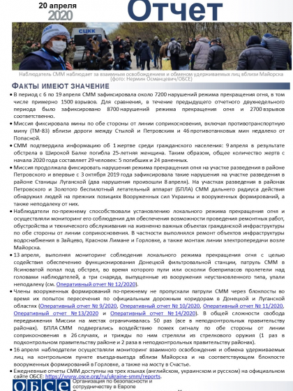 В отчете представлен обзор работы Специальной мониторинговой миссии ОБСЕ (СММ), последние события и новости по состоянию на 20 апреля 2020 года.