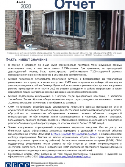 В отчете представлен обзор работы Специальной мониторинговой миссии ОБСЕ (СММ), последние события и новости по состоянию на 4 мая 2020 года.