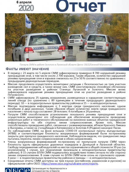В отчете представлен обзор работы Специальной мониторинговой миссии ОБСЕ (СММ), последние события и новости по состоянию на 6 апреля 2020 года.
