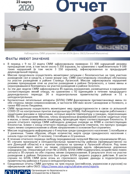 В отчете представлен обзор работы Специальной мониторинговой миссии ОБСЕ (СММ), последние события и новости по состоянию на 23 марта 2020 года.