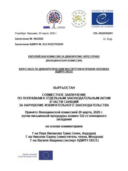 Совместное заключение Венецианской комиссии Совета Европы и БДИПЧ ОБСЕ по поправкам к отдельным законодательным актам в части санкций за нарушение избирательного законодательства Кыргызской Республики