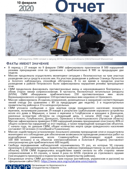 В отчете представлен обзор работы Специальной мониторинговой миссии ОБСЕ (СММ), последние события и новости по состоянию на 10 февраля 2020 года.