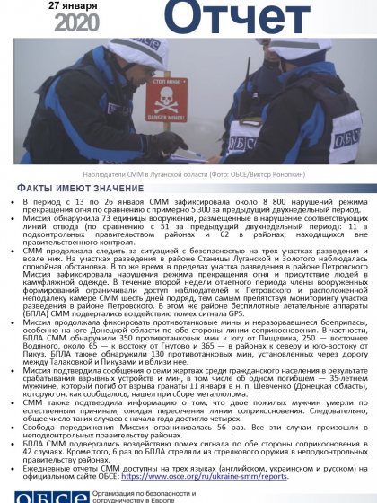 В отчете представлен обзор работы Специальной мониторинговой миссии ОБСЕ (СММ), последние события и новости по состоянию на 27 января 2020 года.