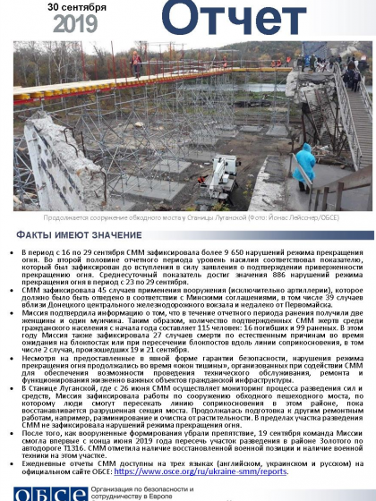 В отчете представлен обзор работы Специальной мониторинговой миссии ОБСЕ (СММ), последние события и новости по состоянию на 30 сентября 2019 года.