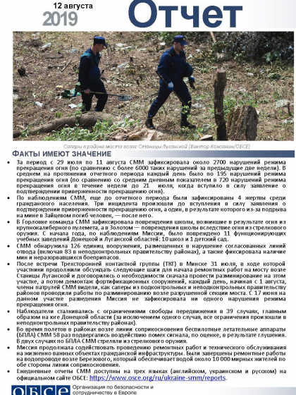 В отчете представлен обзор работы Специальной мониторинговой миссии ОБСЕ (СММ), последние события и новости по состоянию на 12 августа 2019 года.