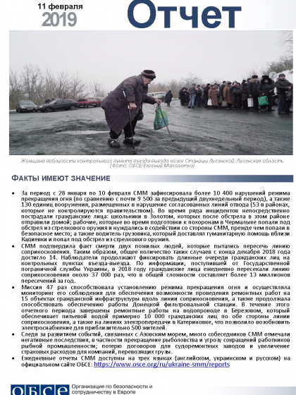 В отчете представлен обзор работы Специальной мониторинговой миссии ОБСЕ (СММ), последние события и новости по состоянию на 11 февраля 2019 года.