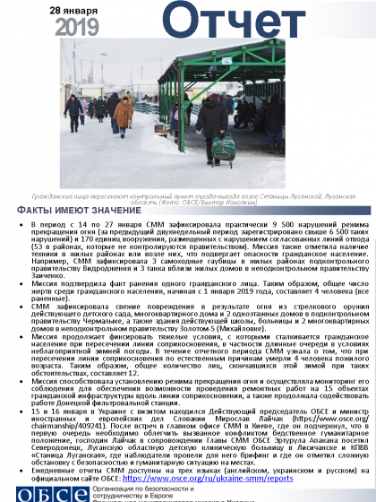 В отчете представлен обзор работы Специальной мониторинговой миссии ОБСЕ (СММ), последние события и новости по состоянию на 28 января 2019 года.