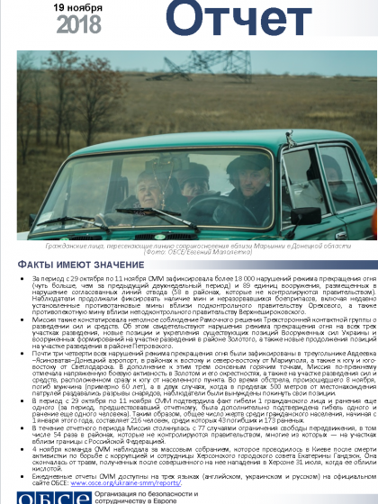 В отчете представлен обзор работы Специальной мониторинговой миссии ОБСЕ (СММ), последние события и новости по состоянию на 19 ноября 2018 года.