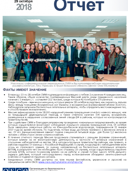 В отчете представлен обзор работы Специальной мониторинговой миссии ОБСЕ (СММ), последние события и новости по состоянию на 29 октября 2018 года.