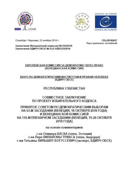Настоящее заключение составлено с целью оказания содействия органам государственного управления Республики Узбекистан, политическим партиям и гражданскому обществу в их усилиях по приведению избирательной нормативно-правовой базы в соответствие с обязательствами в рамках ОБСЕ, стандартами Совета Европы и другими международными обязательствами по демократическим выборам. Заключение подготовлено в ответ на запрос Председателя Центральной избирательной комиссии Республики Узбекистан, адресованный Бюро по демократическим институтам и правам человека (БДИПЧ) ОБСЕ и Венецианской комиссии Совета Европы в июле 2018 г. Заключение было принято Советом по демократическим выборам Совета Европы на его 63-м заседании (Венеция, 18 октября 2018) и Венецианской комиссией на ее 116-й пленарной сессии (Венеция,19-20 октября 2018).
