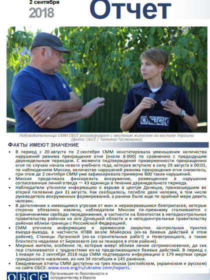 В отчете представлен обзор работы Специальной мониторинговой миссии ОБСЕ (СММ), последние события и новости по состоянию на 2 сентября 2018 года.