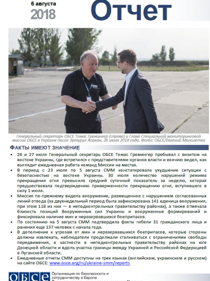 В отчете представлен обзор работы Специальной мониторинговой миссии ОБСЕ (СММ), последние события и новости по состоянию на 6 августа 2018 года.