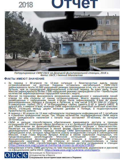 В отчете представлен обзор работы Специальной мониторинговой миссии ОБСЕ (СММ), последние события и новости по состоянию на 27 мая 2018 года.