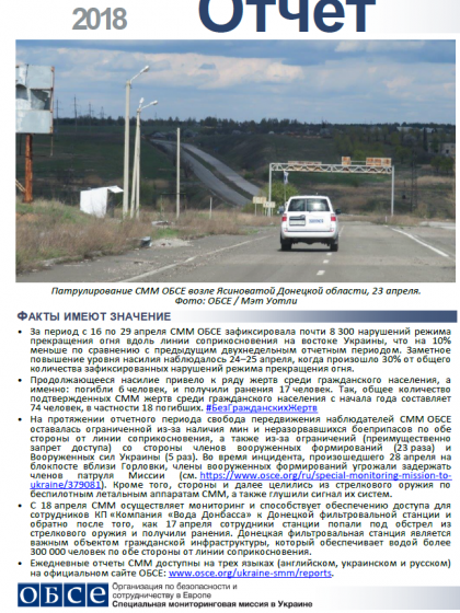 В отчете представлен обзор работы Специальной мониторинговой миссии ОБСЕ (СММ), последние события и новости по состоянию на 2 мая 2018 года.