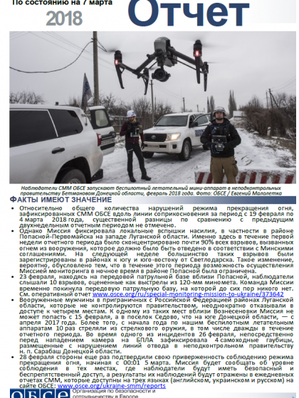 В отчете представлен обзор работы Специальной мониторинговой миссии ОБСЕ (СММ), последние события и новости по состоянию на 7 марта 2018 года.