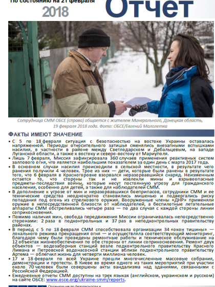 В отчете представлен обзор работы Специальной мониторинговой миссии ОБСЕ (СММ), последние события и новости по состоянию на 21 февраля 2018 года.