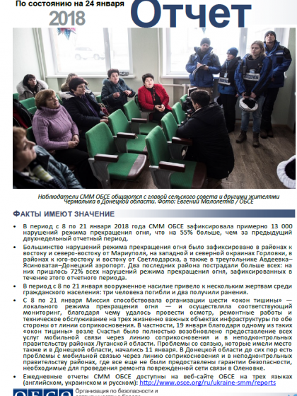 В отчете представлен обзор работы Специальной мониторинговой миссии ОБСЕ (СММ), последние события и новости по состоянию на 24 января 2018 года.