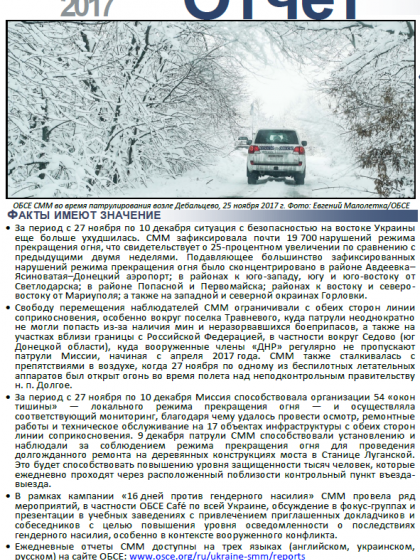 В отчете представлен обзор работы Специальной мониторинговой миссии ОБСЕ (СММ), последние события и новости по состоянию на 13 декабря 2017 года.