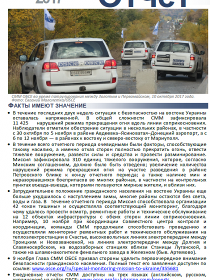 В отчете представлен обзор работы Специальной мониторинговой миссии ОБСЕ (СММ), последние события и новости по состоянию на 15 ноября 2017 года.