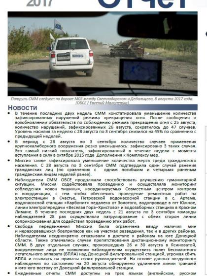 В отчете представлен обзор работы Специальной мониторинговой миссии ОБСЕ (СММ), последние события и новости по состоянию на 6 сентября 2017 года.