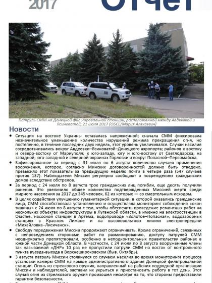 В отчете представлен обзор работы Специальной Мониторинговой Миссии ОБСЕ (СММ), последние события и новости по состоянию на 9 августа 2017 года.