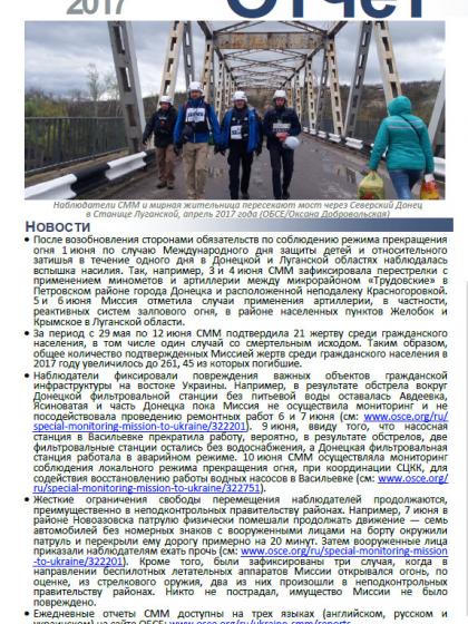 В отчете представлен обзор работы Специальной Мониторинговой Миссии ОБСЕ (СММ), последние события и новости по состоянию на 14 июня 2017 года.