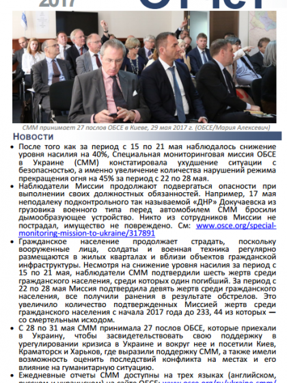 В отчете представлен обзор работы Специальной Мониторинговой Миссии ОБСЕ (СММ), последние события и новости по состоянию на 31 мая 2017 года.