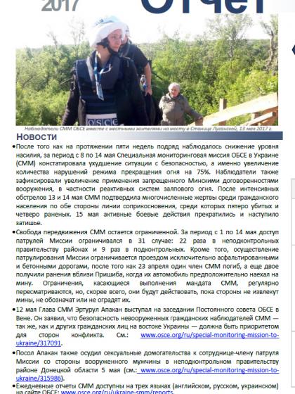 В отчете представлен обзор работы Специальной Мониторинговой Миссии ОБСЕ (СММ), последние события и новости по состоянию на 17 мая 2017 года.